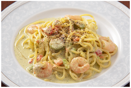 ぷりっぷりのエビとトロッとしたアボカドの食感を香り豊かでまろやかなバジルクリームソースが包み込みます。